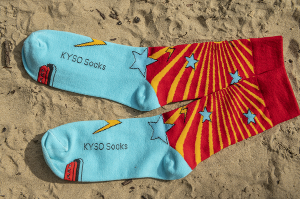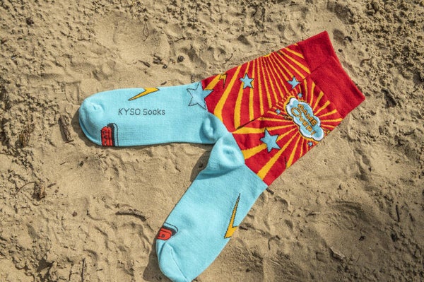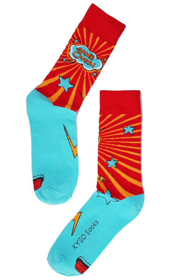 Een opvallende sok met aan de bovenkant "GAME OVER" en aan de onderkant een startknop om het spel opnieuw te starten.